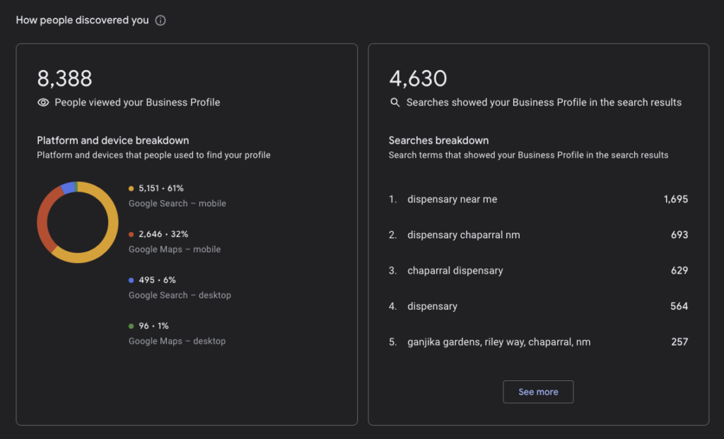 Our team crafted a comprehensive approach focusing on local SEO and Google Business Profile optimization. We developed content that highlighted what makes Ganjika Gardens special: their product expertise, exceptional customer service, and dedication to community education. Working within New Mexico’s marketing guidelines, we created authentic, informative content that resonated with their target audience.